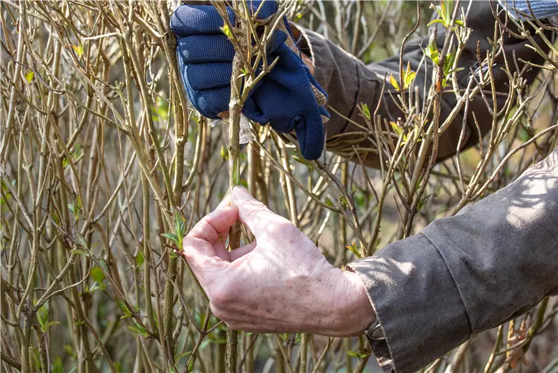 Entfernt man die alten Blütenstände im Frühling, kann die Pflanze ihre ganze Kraft in die Bildung neuer Triebe stecken. Geschnitten wird deshalb oberhalb eines gesunden und grünen Knospenpaares. Das Entfernen der alten Blütenstände kann man dann auch direkt als Anlass nehmen, die Pflanze von abgestorbenen oder erfrorenen Trieben zu befreien. Wer sich unsicher ist, ob ein Trieb noch lebt oder schon abgestorben ist, kann einfach leicht an der Rinde kratzen. Ist der Trieb unter der Rinde noch grün, lebt der Ast. Ist das Gewebe unter der Rinde allerdings trocken und faserig, kommt für diesen Zweig jede Rettung zu spät. Er kann und sollte abgeschnitten werden. Das hat nicht nur gesundheitliche Gründe, die Pflanze wächst dadurch auch ästhetischer und buschiger weiter.