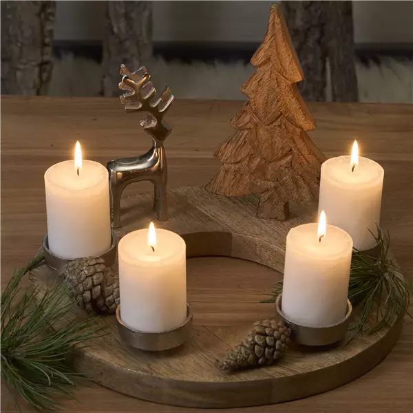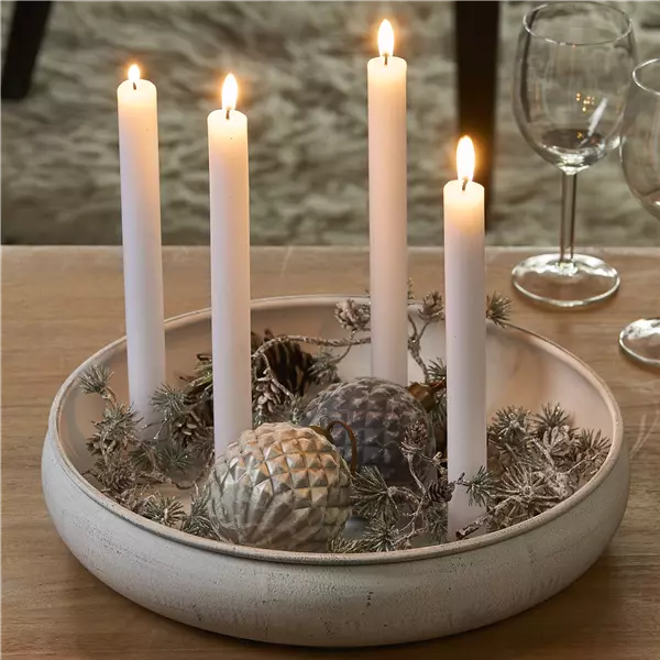 Es müssen nicht immer klassische Adventskränze sein. Im Weihnachtstrend „Soft Metallics“ passen sich auch festliche Schalen in die Weihnachtsdekoration mit ein. Die runde, weiße Magnet-Kerzenschale glänzt auf jedem Tisch und lädt zum individuellen Platzieren der Kerzen und anderen Accessoires ein. Besonders schön wirkt diese Schale auch mit Weihnachtskugeln.