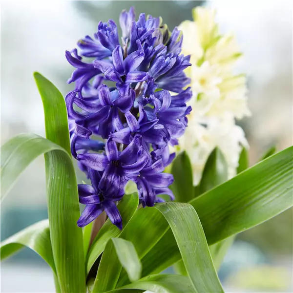 Die glänzend grünen Laubblätter sind schmal und streifenartig und erscheinen zusammen mit den Blüten. Die zahlreichen Blüten stehen in traubigen Blütenständen zusammen und verströmen einen süßlichen Duft. Je nach Sorte sind die Blüten blau, rosa, lila oder weiß gefärbt. Hyazinthen bevorzugen einen Platz im Garten oder einen kühleren Platz in der Wohnung.