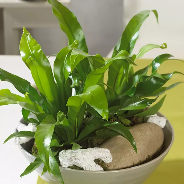 Der Nestfarn (Asplenium antiquum) stammt aus Asien und überzeugt mit leuchtend grünen, spitzen Blättern. Er kann ganzjährig bei Zimmertemperatur an einem hellen Standort, vor direkter Sonneneinstrahlung geschützt, platziert werden. Er benötigt regelmäßige Wassergaben und eine hohe Luftfeuchtigkeit. Der Nestfarn sollte nie vollständig austrocknen oder zu nasses Substrat haben. Übrigens: Neben den optischen Reizen überzeugt der Nestfarn mit einem weiteren Merkmal. Er gibt einen sehr hohen Anteil des Gießwassers an die Raumluft ab und ist daher ein effektiver Raumluftbefeuchter.