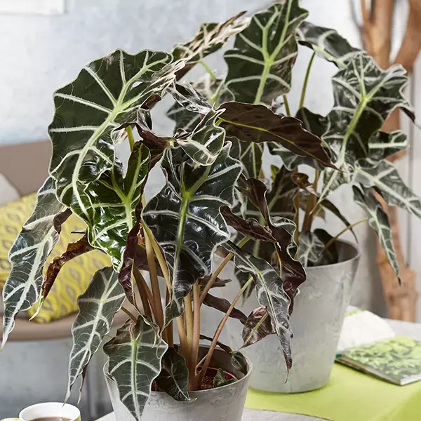 Die dreieckig geformten, spitz zulaufenden Blätter des Pfeilblatts (Alocasia sanderiana) sind auf der Unterseite dunkel eingefärbt und seitlich gewellt. Mit ihren starken hellgrünen Adern zählen sie zu den außergewöhnlichsten und schönsten Blattgewächsen. Sie sind allerdings nicht sehr pflegeleicht. Pfeilblätter möchten einen warmen, hellen bis halbschattigen Standort mit hoher Luftfeuchtigkeit. Die Pflanzen müssen regelmäßig gegossen werden. Die obere Erdschicht sollte vor der nächsten Wassergabe trocken sein. Verwenden Sie kalkarmes, weiches Wasser in Zimmertemperatur. Ihr größter Anspruch ist die hohe Luftfeuchtigkeit. Besprühen Sie die Alokasie täglich mit kalkarmem Wasser. Im Winter sollte die Temperatur für sie nicht unter 18 °C liegen und im Sommer sind 20 bis 25 °C perfekt.