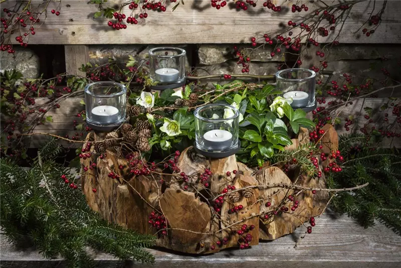 Kein Problem, auch nicht bei wenig Zeit. Dann greift man zur klassischen Variante. Wenn Sie das Grün aus dem eigenen Garten holen können – umso besser! Selberbinden macht wenig Arbeit. Die Tannenzweige zuschneiden, auf einen handelsüblichen Rohling legen und mit Draht befestigen. Vier Kerzen hinzufügen ist auch schnell getan. Schon bei deren Farbe beginnt Ihr Kranz jetzt individuell zu werden. Erst recht macht die Dekoration die persönliche Note aus. Die Gewächse mit den leuchtenden Beeren haben nun ihren großen Auftritt, zum Beispiel der Feuerdorn. Schon ein paar kleine Zweige peppen den Kranz auf. Efeu ist auch nicht nur zum Verschönern von Fassaden gut. Als Kranzschmuck findet er eine weitere Aufgabe. Weihnachtskugeln, passend zu den Kerzen, machen die Sache schon rund. Figuren aller Art steckt man je nach Geschmack noch ins frische Grün. Immer beliebter werden Bänder aus edlen Stoffen oder sogar Perlen, die man leger-kunstvoll hinzufügt. Sie haben noch Früchte von Ihrem Nussbaum übrig? Legen Sie sie in die leere Mitte, zusammen mit Orangen oder Äpfeln.