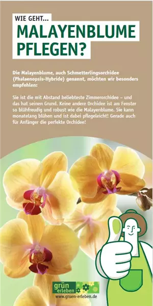 Die Malayenblume, auch Schmetterlingsorchidee (Phalaenopsis-Hybride) genannt, möchten wir besonders empfehlen: Sie ist die mit Abstand beliebteste Zimmerorchidee – und das hat seinen Grund. Keine andere Orchidee ist am Fenster so blühfreudig und robust wie die Malayenblume. Sie kann monatelang blühen und ist dabei pflegeleicht! Gerade auch für Anfänger die perfekte Orchidee!