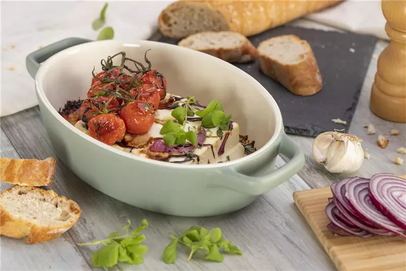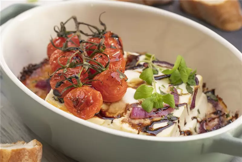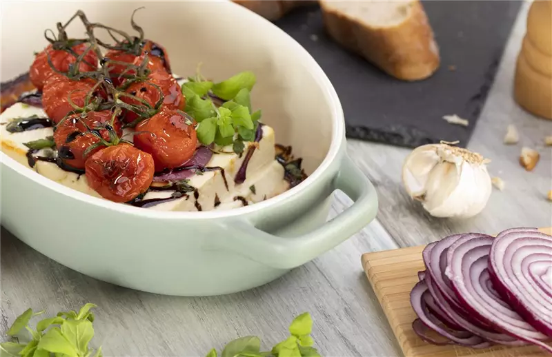 Den Ofen in der Zwischenzeit auf 200 Grad vorheizen und dann den Feta für 20-25 Minuten im Ofen backen. Tipp: Der Feta schmeckt besonders gut zu Brot oder als Beilage zum Fleisch auf dem Grill.
