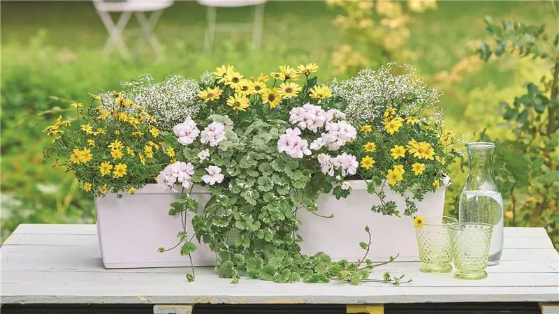 Dieser Balkonkasten lebt von Helligkeit und Leichtigkeit. Die Kombination aus Weiß- und Gelbtönen bringt Frische auf den Balkon, wirkt offen, freundlich und sommerlich.