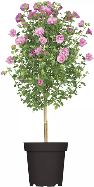 Als stimmiger Begleiter zum Balkonkasten eignet sich das KAPMALEVEN-STäMMCHEN (Anisodontea capensis) im Kübel besonders gut. Seine leuchtenden Blüten greifen die kräftige Farbwelt auf und bringen zusätzlich Höhe und Struktur auf den Balkon.