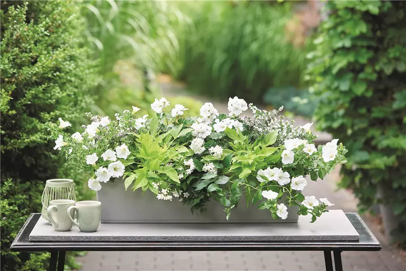 Dieser Balkonkasten setzt auf ruhige Farben und ein ausgewogenes Zusammenspiel aus Blüten und Blattwerk. Weiß- und Grüntöne bestimmen das Bild und schaffen eine entspannte, klare Wirkung. Die Bepflanzung wirkt modern, leicht und zugleich sehr natürlich.
