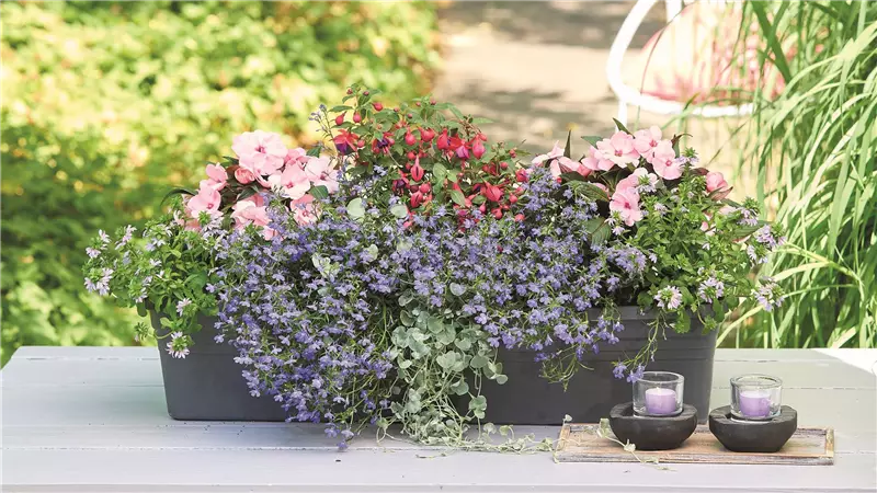 Im Zentrum steht die FUCHSIE (Fuchsia-Hybride). Ihre eleganten, leicht schwebenden Blüten geben der Pflanzung Höhe. Von hier aus entfaltet sich der Kasten nach allen Sei-ten und wirkt dabei weich, harmonisch und ausgewogen. Die FLEISSIGEN LIESCHEN (Impa-tiens neuguinea) greifen die Rosé-Töne auf und sorgen rund um die Fuchsie für eine geschlossene Blütenfläche. Die feinen blau-violetten Blüten des MäNNERTREUS (Lobelia richardii) wachsen über den Rand hinaus und lassen den Kasten sanft auslaufen. Der SILBERREGEN (Dichondra argentea) ergänzt die Pflanzung mit silbrig schimmerndem Blattwerk und bringt Tiefe, ohne die Farbwirkung zu unterbrechen. So entsteht ein Balkonkasten, der von Übergängen lebt. Keine Pflanze steht für sich allein, alles greift ineinander. Ein Traum in Blau, Lila und Rosé.