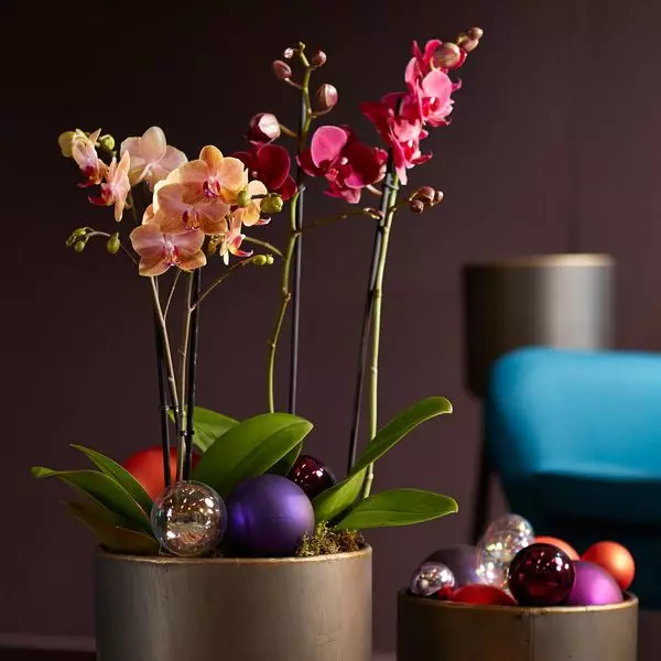 Mit Schmetterlingsorchideen (Phalaenopsis) in Ihren Lieblingsfarben kreieren Sie bunt-fröhlichen Festtagsschmuck. Kombinieren Sie dazu farblich passende Kugeln, am besten in glänzend und matt. Durch die lange Blühdauer wird Sie diese Orchidee farbenfroh durch die Adventszeit begleiten. In Räumen mit niedriger Luftfeuchtigkeit sollten die Pflanzen, besonders die Luftwurzeln, öfter besprüht werden. Das Substrat wird regelmäßig, jedoch mäßig gegossen –