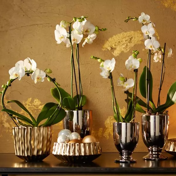 Weiße Schmetterlingsorchideen (Phalaenopsis) kommen in der Natur mit am häufigsten vor. Gut so, denn auch wir können uns an ihnen nicht satt sehen. Kombinieren Sie die weißen Blütenstars mit massiven Accessoires in Gold. Dieser Kontrast lässt die Zartheit der Blüten noch deutlicher werden.