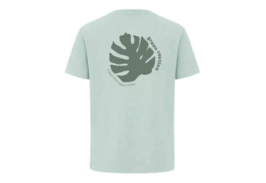 • Motiv: Monstera-Blatt mit Aufschrift hinten: green routine - plants make people happy. Monstera Blatt vorne.