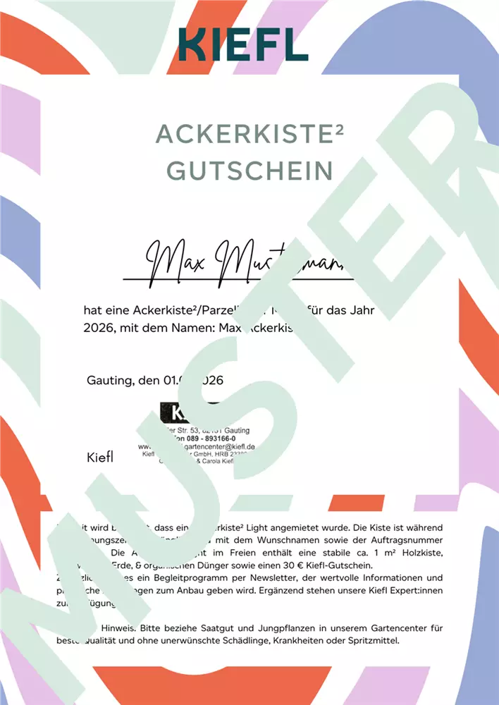 Wir fertigen Dir einen Gutschein für eine Ackerkiste bzw. Parzelle an – wahlweise zum Ausdrucken per E-Mail oder wir versenden den Gutschein per Post.