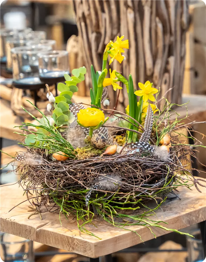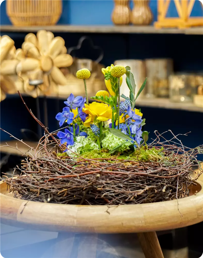 In unserem Floristik-Workshop gestaltest Du Dein eigenes Osternest – wahlweise in Gelb oder Blau. In entspannter Atmosphäre zeigt Dir Carola Schritt für Schritt die Technik und gibt Dir praktische Tipps zu Materialauswahl, Aufbau, Proportionen, Haltbarkeit und Pflege, damit Dein Osternest lange schön bleibt.