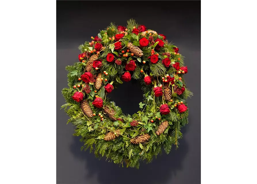 Der kopfgarnierte Trauerkranz "Laura" ist ein Blickfang mit roten Rosen.