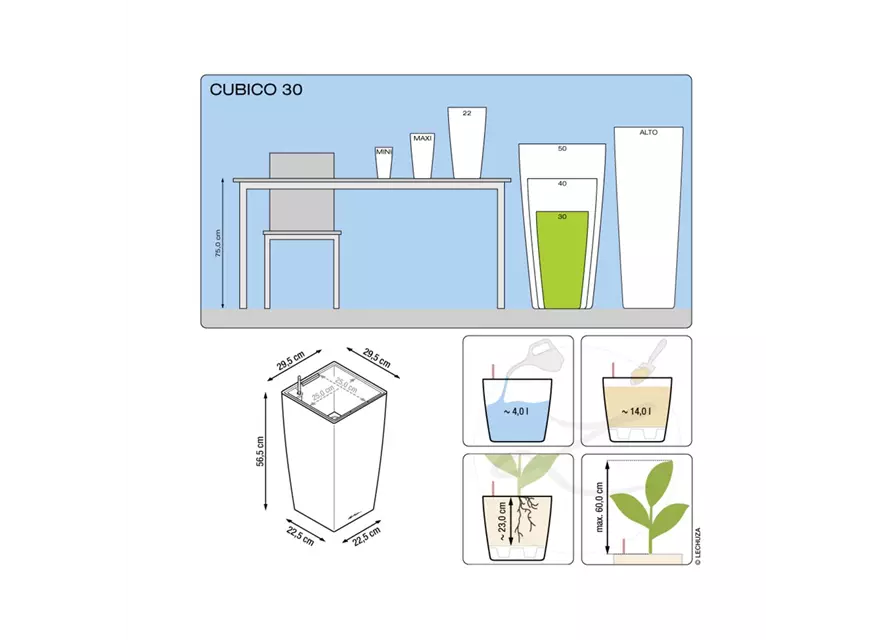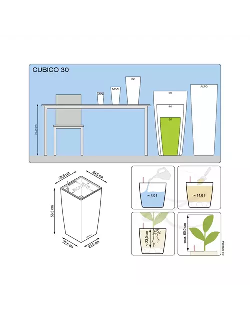 Der LECHUZA-Klassiker! Die elegante Säule ist bereits seit 2003 Bestandteil des LECHUZA-Sortiments und erfreut sich ungebrochener Beliebtheit. CUBICO kann in zahlreichen Größen und Farben inszeniert werden – dezent in einem Arrangement aus mehreren Gefäßen oder solitär als Deko-Highlight. Auch Mehrfachbepflanzungen finden in der edlen Säule einen stilvollen Rahmen.
