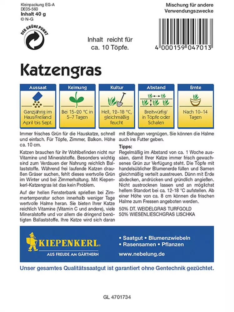 Als Katzengras werden verschiedene Gräser bezeichnet, die in Wohnungen herangezogen werden, damit Katzen davon Fressen können. Katzen, die keinen Freigang und keinen Zugang zu Gras oder anderen Pflanzen im Freiland haben, neigen manchmal dazu Zimmerpflanzen anzufressen. <br> Das Fressen von Gras erleichtert der Katze das Herauswürgen von unverdaulichen Haarballen, die sie bei der Fellpflege verschluckt. Meisten passieren die Haare den Magen-Darm-Trakt der Katze ohne Probleme. Größere Mengen, die zum Beispiel währen des Fellwechsels aufgenommen werden, können aber im Verdauungstrakt verklumpen und im Extremfall zu einem Darmverschluss führen. Durch das gefressene Gras werden die Haare gebunden und können von der Katze leichter herausgewürgt werden. Auch Kleintiere wie Meerscheinchen und Ziervögel fressen gerne Katzengras.<br> Unsere Katzengras-Mischung enthält zu 50% Deutsches Weidelgras und zu 50% Wiesenlieschgras. Nach unserer Erfahrung haben diese zwei Grasarten bei Katzen eine besonders hohe Akzeptanz. Aber die Geschmäcker sind auch bei Katzen verschieden. Als Alternative mit helleren, breiteren Halmen können auch unsere Weizen-Keimsprossen für die Anzucht von Katzengras verwendet werden.