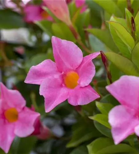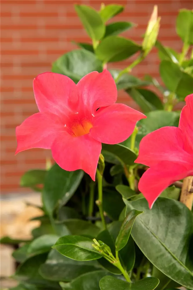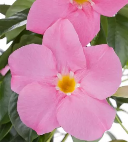 Die immergrünen Blätter der Dipladenia 'Rio' sind glänzend, eiförmig.