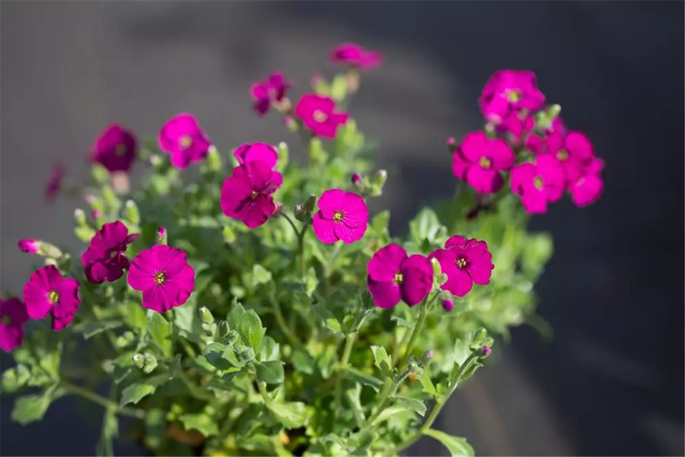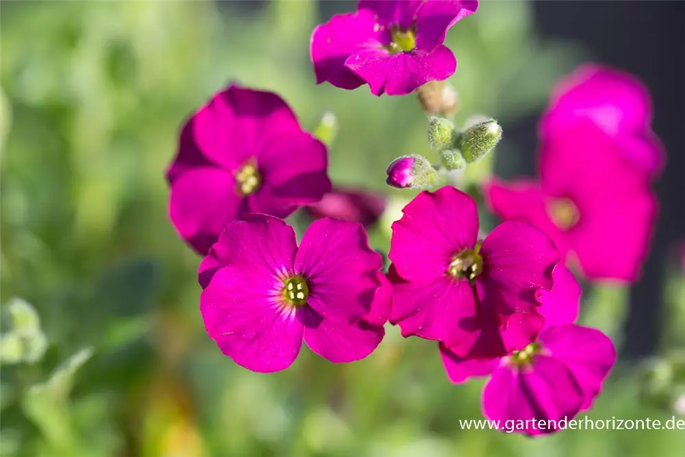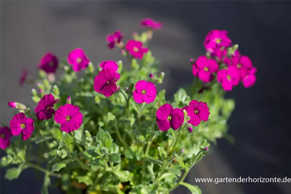 Aubrieta x cultorum 'Regado Red' bildet radförmige, purpurrote Blüten ab April.