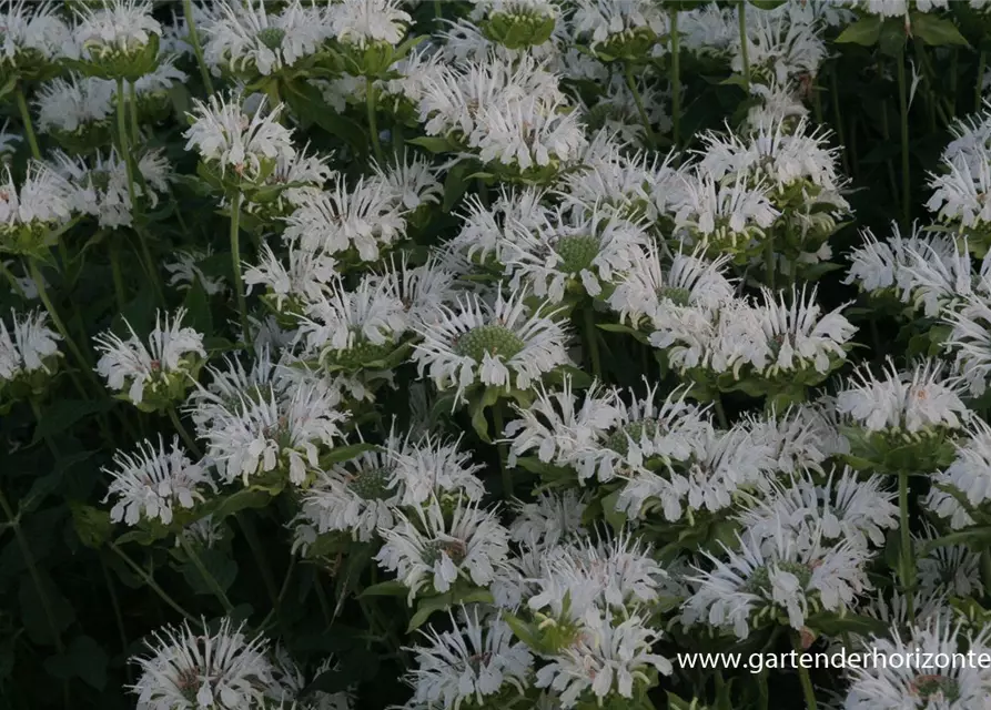 Monarda fistulosa 'Schneewittchen' bildet lippenförmige, in Quirlen angeordnete, weiße Blüten ab Juni.
