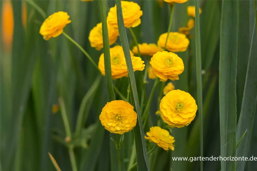 Ranunculus acris 'Multiplex' bildet gefüllte, ballförmige, gelbe Blüten ab Mai.