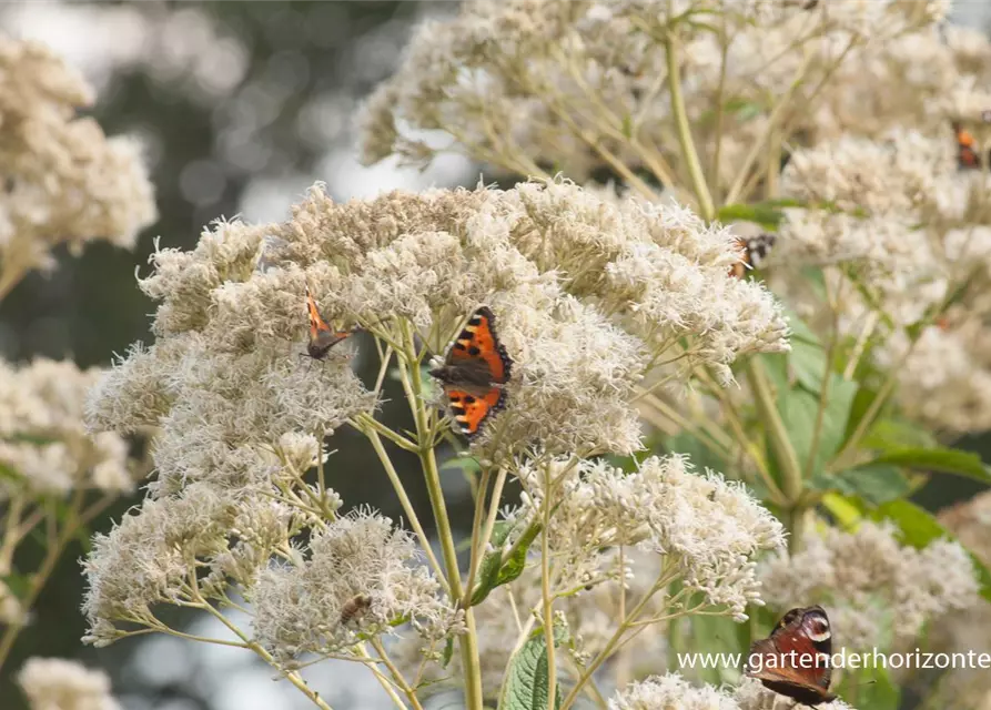 Der Große Garten-Wasserdost 'Bartered Bride' (Eupatorium fistulosum) ist eine aufrechte Staude, die von Juli bis September weiße, in Doldentrauben angeordnete Blüten mit einem angenehmen Duft bildet. An einem sonnigen bis halbschattigen Standort mit durchlässigem, nährstoffreichem Boden erreicht er gewöhnlich eine Höhe von ca. 1,8 m und wird ca. 1 m breit. Der Große Garten-Wasserdost 'Bartered Bride' ist gut frostverträglich.