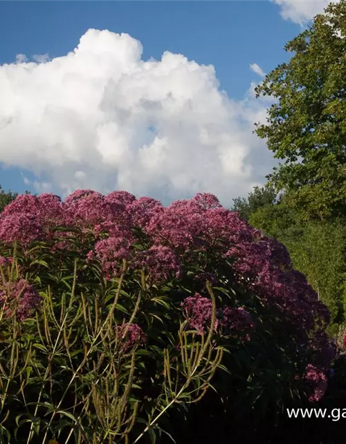 Der Große Garten-Wasserdost 'Glutball' (Eupatorium fistulosum) ist eine aufrechte Staude, die von August bis Oktober purpurrote, in Doldentrauben angeordnete Blüten mit einem angenehmen Duft bildet. An einem sonnigen bis halbschattigen Standort mit durchlässigem, nährstoffreichem Boden erreicht er gewöhnlich eine Höhe von ca. 2 m und wird ca. 1 m breit. Der Große Garten-Wasserdost 'Glutball' ist gut frostverträglich.