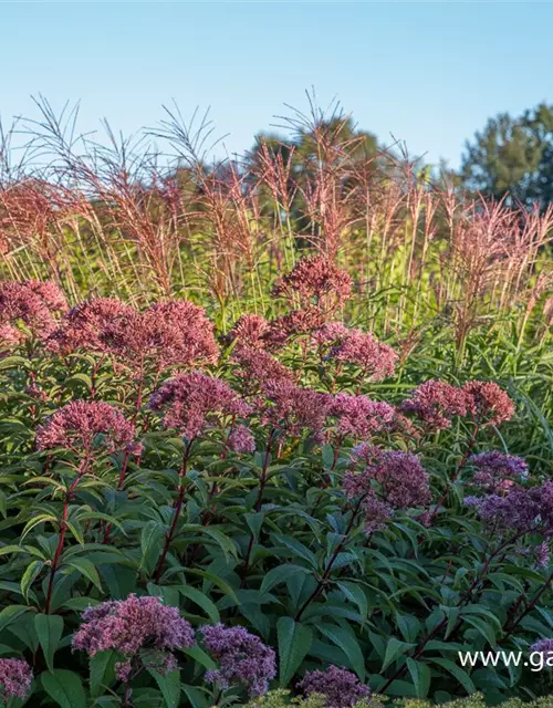 Der Große Garten-Wasserdost 'Riesenschirm' (Eupatorium fistulosum) ist eine aufrechte Staude, die von Juli bis September rote, in Doldentrauben, Dolden angeordnete Blüten mit einem angenehmen Duft bildet. An einem sonnigen bis halbschattigen Standort mit durchlässigem, nährstoffreichem Boden erreicht er gewöhnlich eine Höhe von ca. 2 m und wird ca. 1 m breit. Der Große Garten-Wasserdost 'Riesenschirm' ist gut frostverträglich.