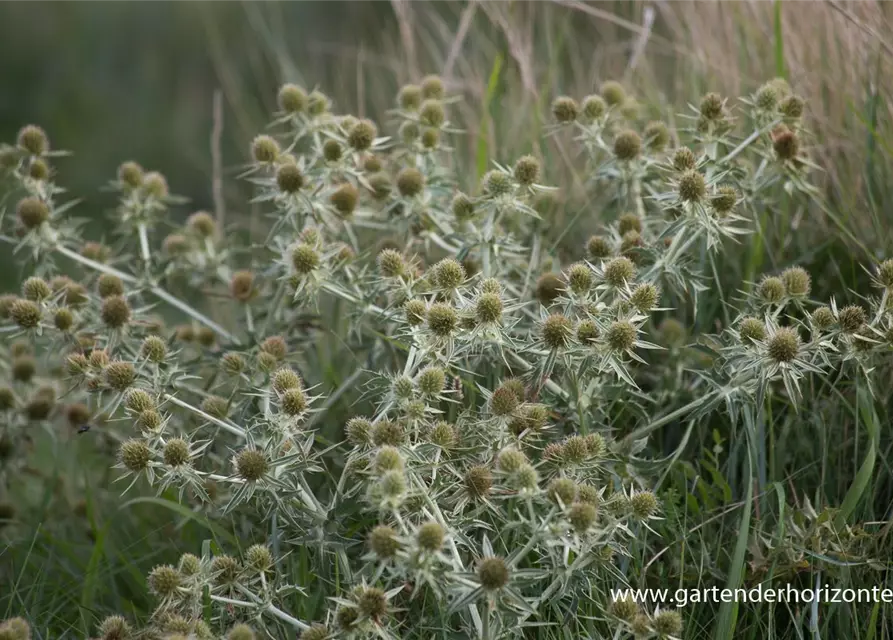 Der Strand-Mannstreu (Eryngium maritimum) ist eine buschige, aufrechte Staude, die von Juni bis Oktober silberweiße, ballförmige Blüten bildet. An einem sonnigen Standort mit durchlässigem, kalkhaltigem, sandigem Boden erreicht er gewöhnlich eine Höhe von ca. 60 cm und wird ca. 80 cm breit. Der Strand-Mannstreu ist gut frostverträglich.