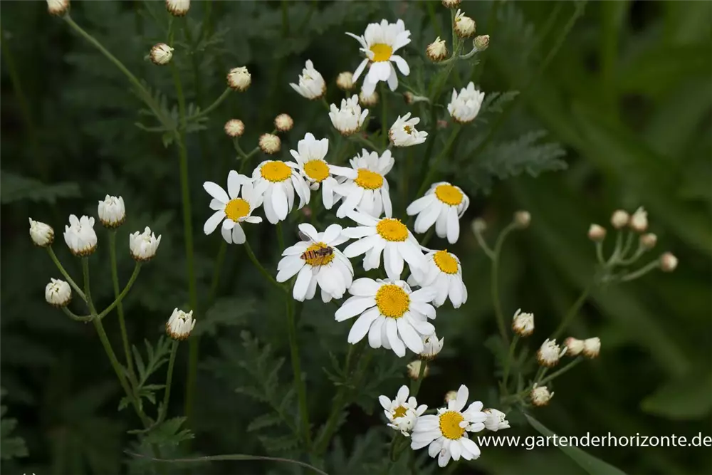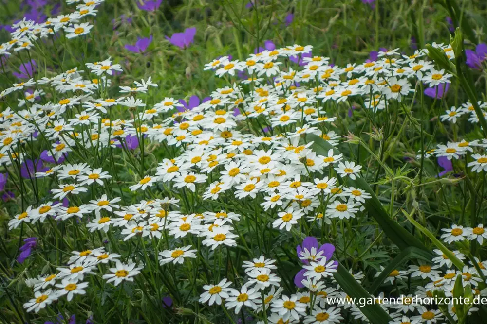 Die Strauß-Margerite (Tanacetum corymbosum) ist eine Staude, die von Juni bis Juli weiße mit gelber Mitte Blüten bildet. An einem sonnigen bis halbschattigen Standort mit durchlässigem, kalkhaltigem, lockerem Boden erreicht sie gewöhnlich eine Höhe von ca. 1 m. Die Strauß-Margerite ist gut frostverträglich.