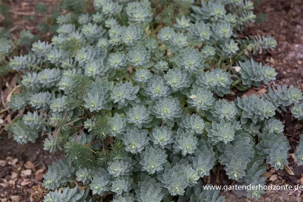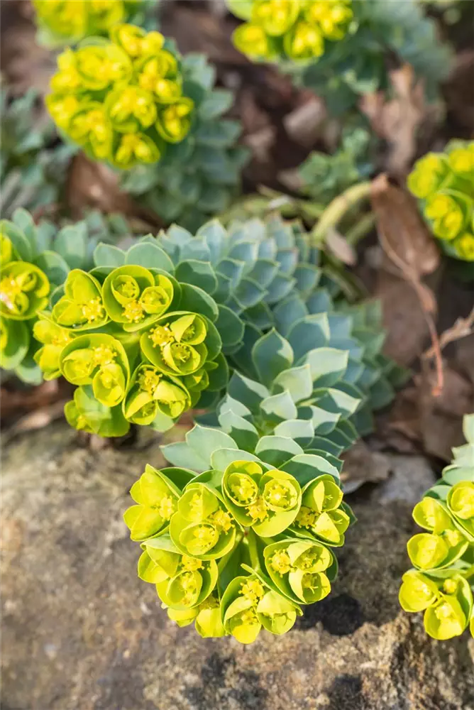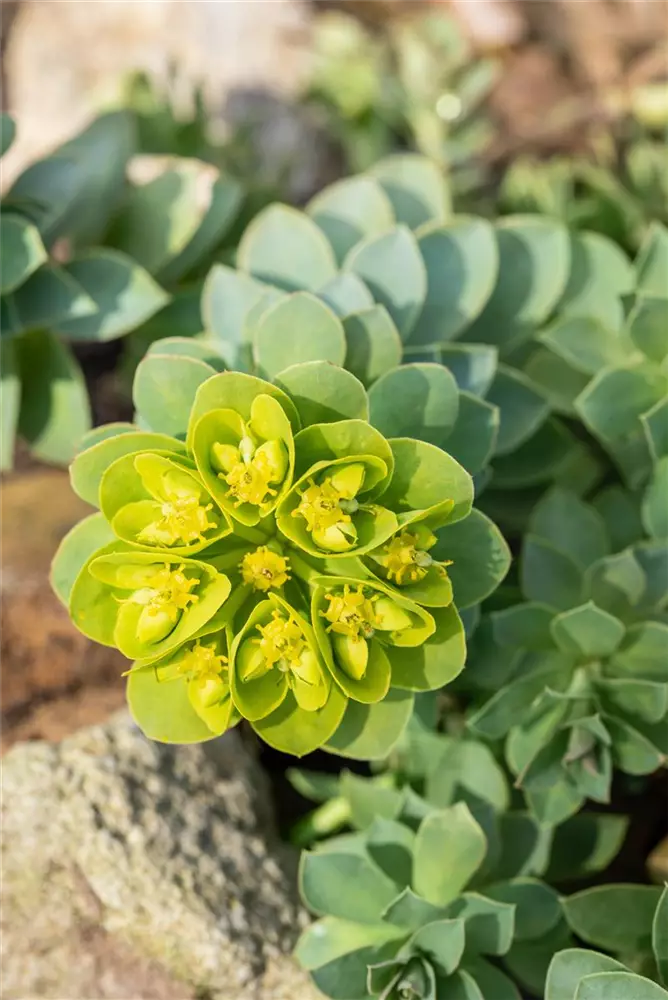 Euphorbia myrsinites bildet grüngelbe Blüten ab Mai.